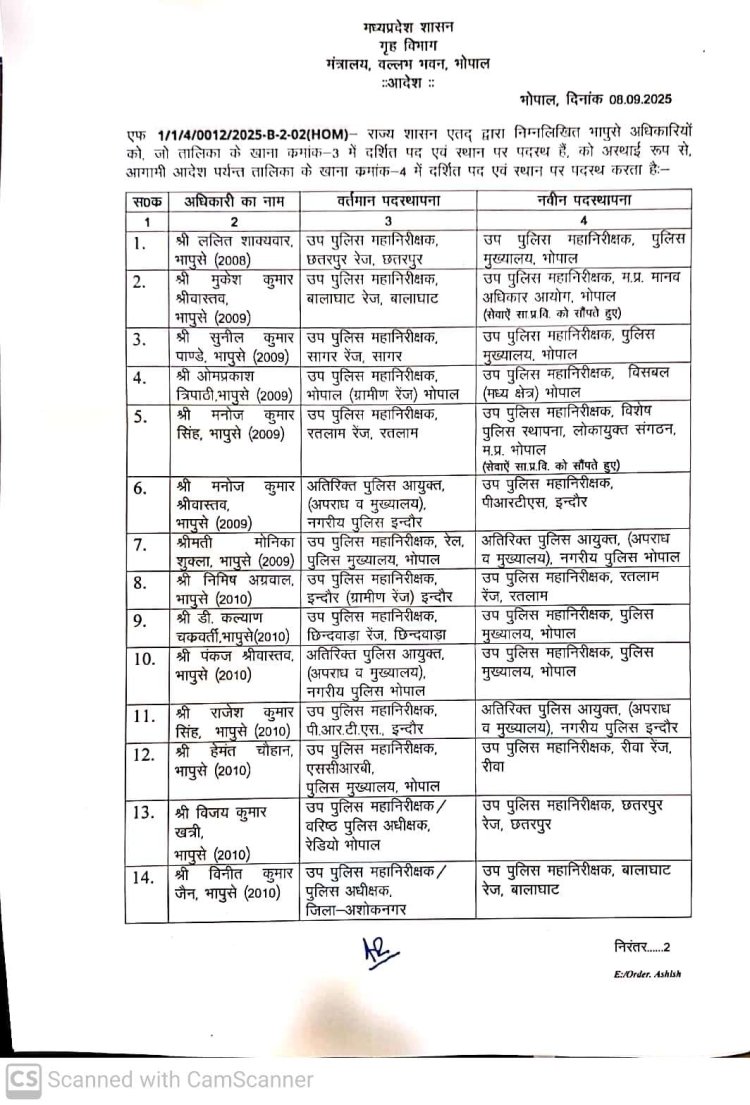 मध्यप्रदेश में राज्य शासन ने 20 आईपीएस अधिकारियों के एक साथ ट्रांसफर किए हैं.