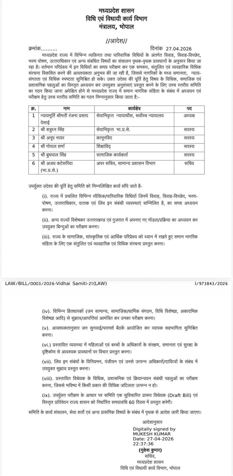 मध्य प्रदेश शासन के विधि एवं विधायी कार्य विभाग की ओर से इस संबंध में आदेश जारी किया गया है। आदेश में कहा गया है कि राज्य में विवाह, तलाक, भरण‑पोषण, उत्तराधिकार, दत्तक ग्रहण और लिव‑इन जैसे मामलों में अलग‑अलग कानून लागू हैं। ऐसे में इन सभी कानूनों की समग्र समीक्षा कर एक समान और न्यायसंगत व्यवस्था की जरूरत महसूस की जा रही थी।