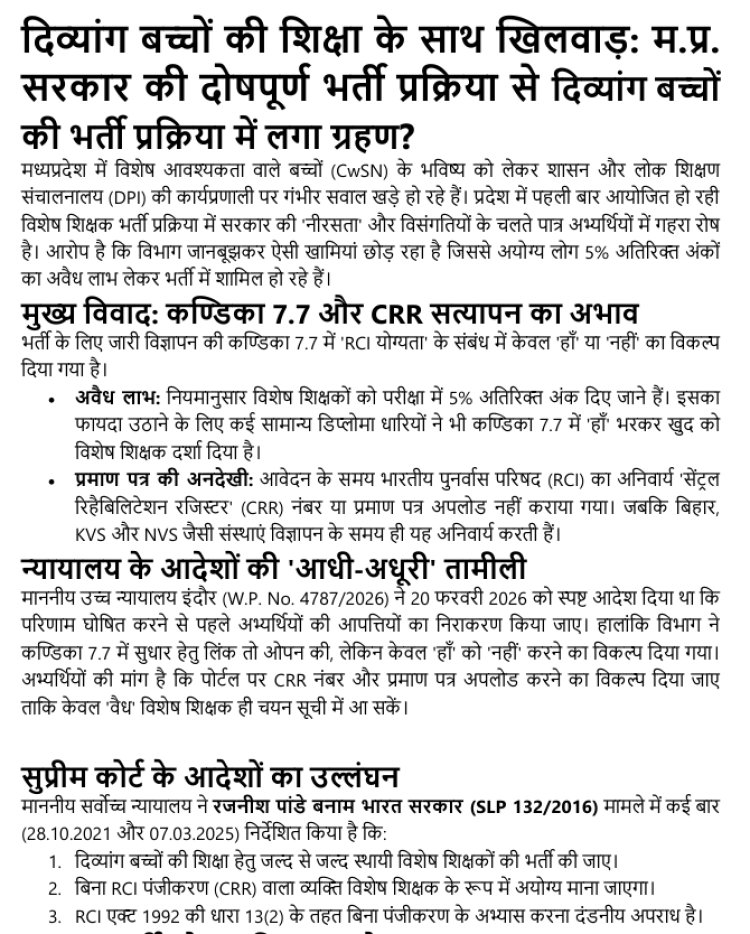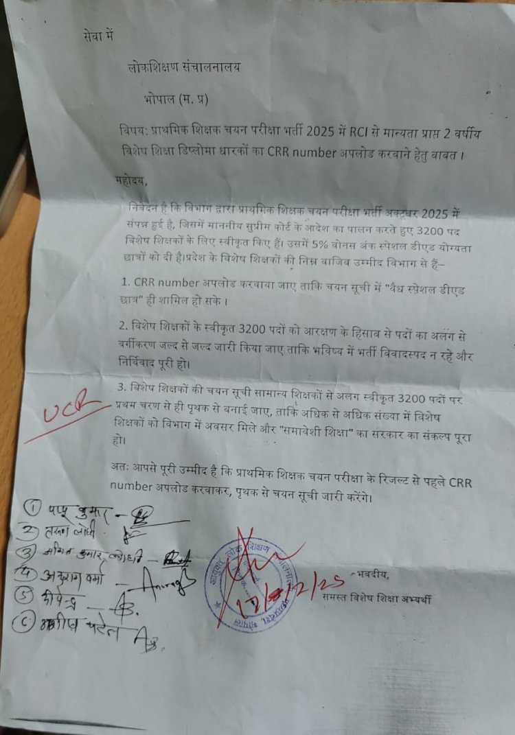 एमपी प्राथमिक शिक्षक भर्ती 2025 में स्पेशल एजुकेटर विवाद, वैध CRR नंबर अपलोड न कराने पर चयन प्रक्रिया पर उठे सवाल