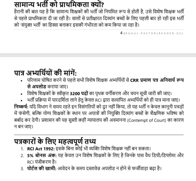 विशेष शिक्षा के अभ्यर्थियों ने आरोप लगाया है कि भर्ती प्रक्रिया में गंभीर अनियमितताएं हुई हैं, जिसके कारण वास्तविक पात्र उम्मीदवारों के अधिकार प्रभावित हो रहे हैं।
