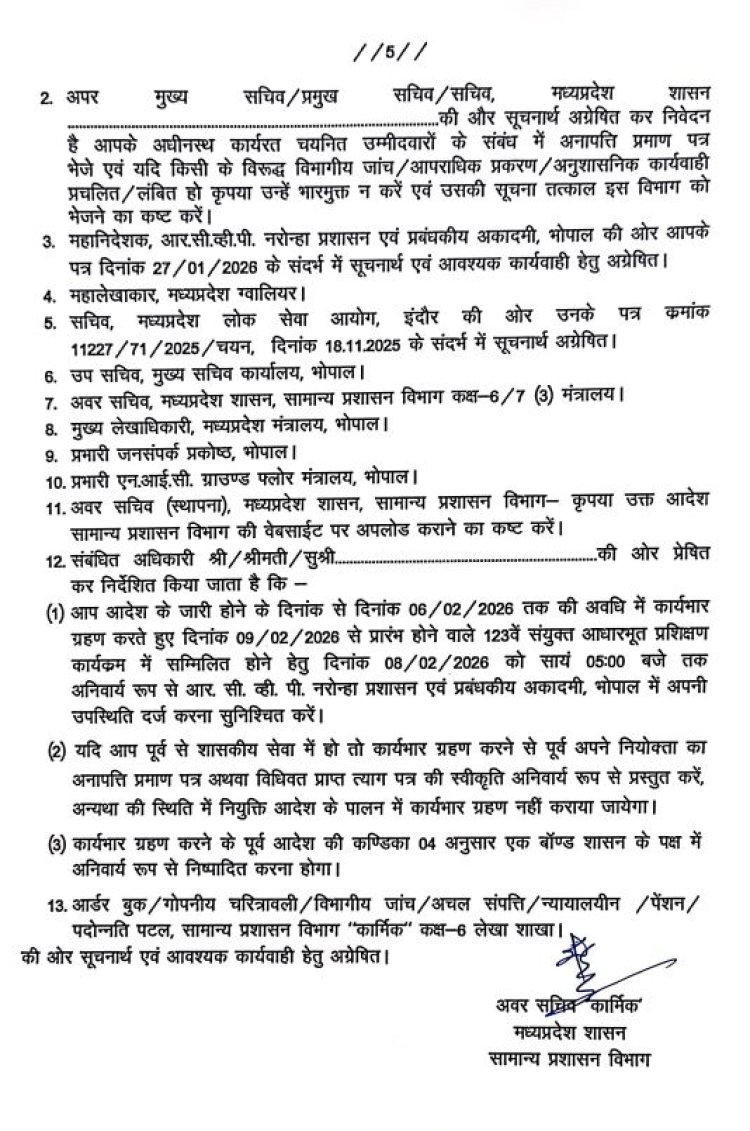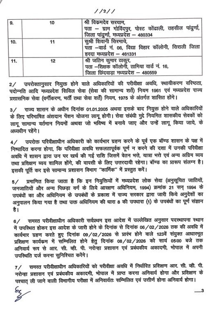 इन नव नियुक्त अधिकारियों को वेतनमान पे-मैट्रिक्स लेवल 12 के तहत 15600-39100 + 5400 ग्रेड पे दिया जाएगा। शासन ने स्पष्ट किया है कि यह नियुक्तियां पूरी तरह से अस्थायी और प्रावधिक आधार पर की गई हैं।नियुक्त उम्मीदवारों को 06 फरवरी 2026 तक अनिवार्य रूप से अपना कार्यभार ग्रहण करना होगा। ट्रेनिंग में शामिल होने के लिए उन्हें 08 फरवरी की शाम तक अकादमी पहुंचना होगा सभी चयनित अभ्यर्थियों का आधारभूत प्रशिक्षण 09 फरवरी से भोपाल स्थित नरोन्हा अकादमी में प्रारंभ होगा। यदि किसी का चरित्र सत्यापन सही नहीं पाया गया, तो नियुक्ति रद्द हो जाएगी।