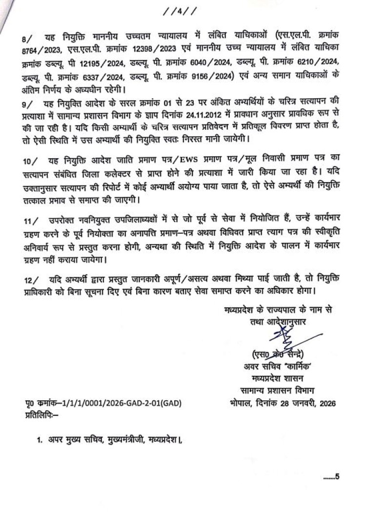 भोपाल:मध्य प्रदेश शासन के सामान्य प्रशासन विभाग मंत्रालय द्वारा राज्य सेवा परीक्षा 2023 और 2024 की मेरिट लिस्ट में से 34 उम्मीदवारों को डिप्टी कलेक्टर के पद पर नियुक्ति दे दी गई है। बुधवार 28 जनवरी 2028 को सामान्य प्रशासन विभाग के द्वारा आदेश जारी किया गया यह परीक्षा मध्य प्रदेश लोक सेवा आयोग इंदौर द्वारा आयोजित की गई थी। SSE 2023 के 23 उम्मीदवार और SSE 2024 के 11 उम्मीदवारों की लिस्ट आज मंत्रालय से जारी हुई। जो इस प्रकार है।