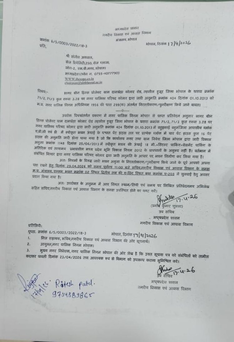 MP के नामी बिल्डर सेज ग्रुप को नोटिस जारी, बिल्डर की आलीशान कॉलोनी में दीवारों पर दरारें, धंस रही जमीन, सागर ग्रीन हिल्स के 16 पेंट हाउस अवैध अनुमतियां निरस्त करने की कार्रवाई शुरु.
