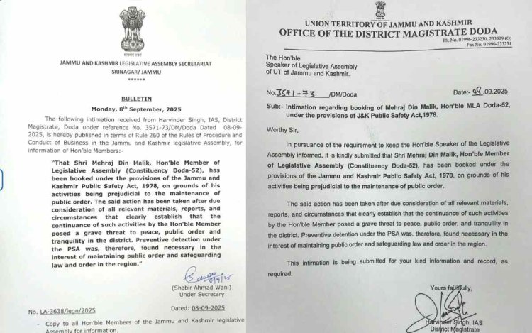 8 सितम्बर 2025 को जम्मू-कश्मीर में आम आदमी पार्टी (AAP) के विधायक मेहराज मलिक को Public Safety Act (PSA) के तहत गिरफ्तार किया गया है। प्रशासन ने उन पर अधिकारियों से बदसलूकी, युवाओं को भड़काने और राहत कार्यों में बाधा डालने जैसे गंभीर आरोप लगाए हैं। उनकी गिरफ्तारी के बाद राज्य की राजनीति में हलचल मच गई है और एक बार फिर PSA जैसे कठोर कानून पर सवाल उठने लगे हैं।