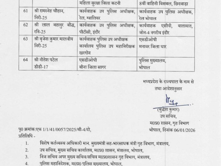 मध्य प्रदेश शासन के गृह विभाग ने राज्य पुलिस सेवा में प्रशासनिक बदलाव करते हुए तबादला आदेश जारी किए हैं। कुल 64 अधिकारियों को नई पदस्थापना दी गई है।
