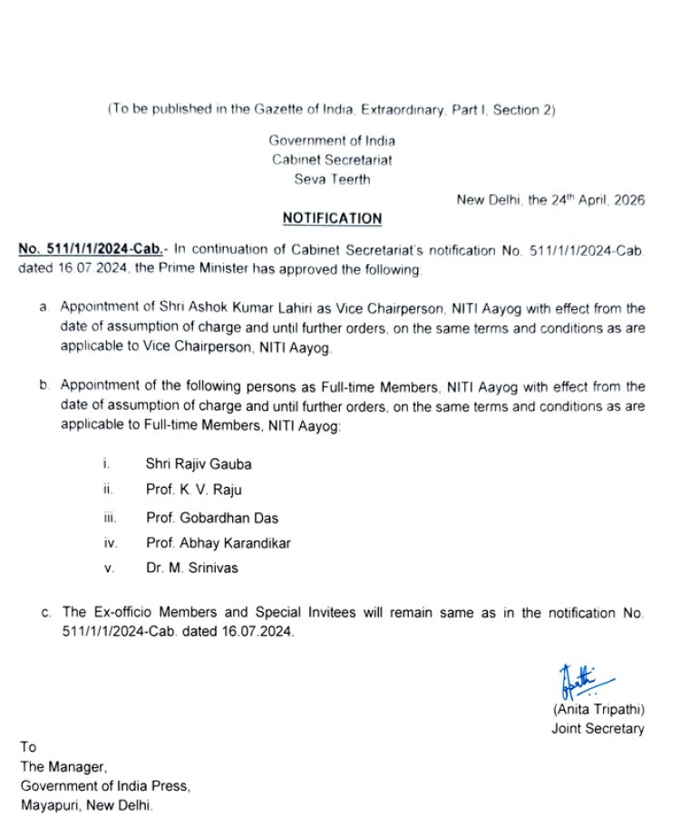 केंद्र सरकार ने नीति आयोग की संरचना में बड़ा बदलाव करते हुए प्रसिद्ध अर्थशास्त्री डॉ. अशोक कुमार लाहिड़ी (Ashok Kumar Lahiri) को आयोग का नया उपाध्यक्ष (Vice Chairman) नियुक्त किया है। इस निर्णय के साथ ही नीति आयोग में पांच नए पूर्णकालिक सदस्यों की भी नियुक्ति की गई है। इनमें वरिष्ठ अधिकारी और शिक्षाविद शामिल हैं, जो देश की आर्थिक और नीति निर्माण प्रक्रिया को नई दिशा देने का काम करेंगे।