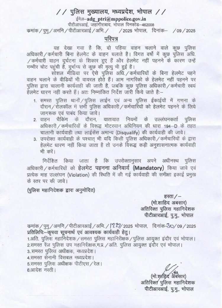भोपाल PTRI ने सभी पुलिस कर्मचारियों और अधिकारियों के लिए हेलमेट पहनना अनिवार्य कर दिया है.