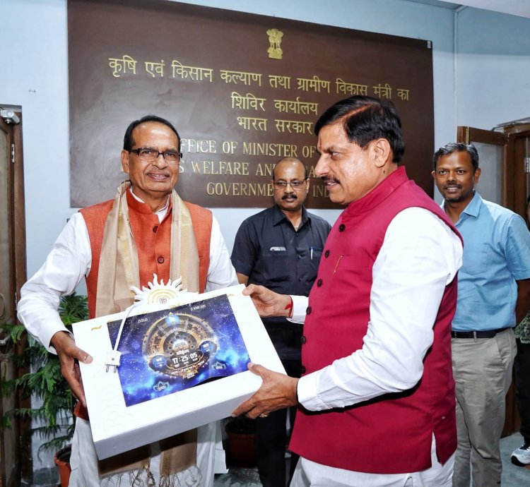 सीएम डॉ. मोहन यादव ने केंद्रीय मंत्री शिवराज से दिल्ली में की मुलाकात वैदिक घड़ी भेंट की