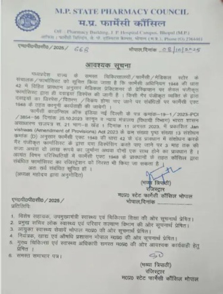 मध्यप्रदेश में 'कोल्ड्रिफ' कफ सिरप से अब तक 23 बच्चों की मौत हो गई है. इसे लेकर अब प्रदेश सरकार ने बड़ा फैसला लिया है. स्टेट फार्मेसी काउंसिल ने सभी मेडिकल स्टोर, अस्पताल और फार्मेसी को बिना रजिस्टर्ड फार्मासिस्ट से दवा खरीदने को लेकर चेतावनी दी है.