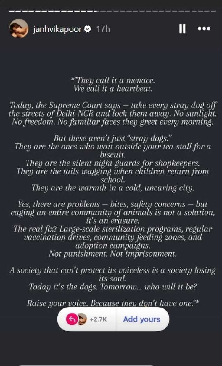 ‘वो खतरा कहते हैं। लेकिन हम दिल की धड़कन कहते हैं। कोर्ट कहता है कि उन्हें बंद कर दो, जहां उन्हें कोई जाना हुआ चेहरा नहीं मिलेगा, ना सूरज की रोशनी। लेकिन ये सिर्फ 'आवारा कुत्ते' नहीं हैं। ये वो हैं, जो बिस्किट के लिए आपकी चाय की दुकान के बाहर इंतजार करते हैं। फिर उनके लिए रात में पहरा देते हैं।'