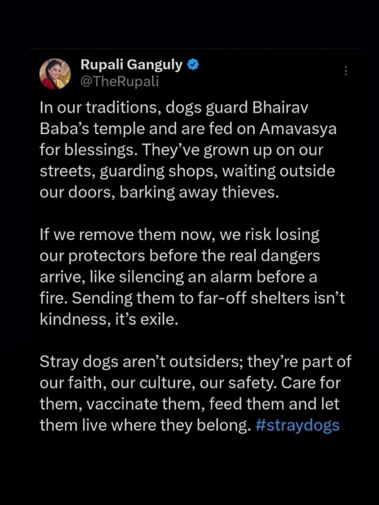'हमारी परंपराओं में कुत्ते भैरव बाबा के मंदिर की रखवाली करते हैं और अमावस्या पर आशीर्वाद के लिए उन्हें खाना खिलाया जाता है। अगर इन्हें हटा दिया गया तो खतरा आने से पहले ही हम अपने रक्षकों को खो देंगे। वो आवारा नहीं हैं। उन्हें टीका लगाएं और वहीं रहने दें, जहां वे हैं।'