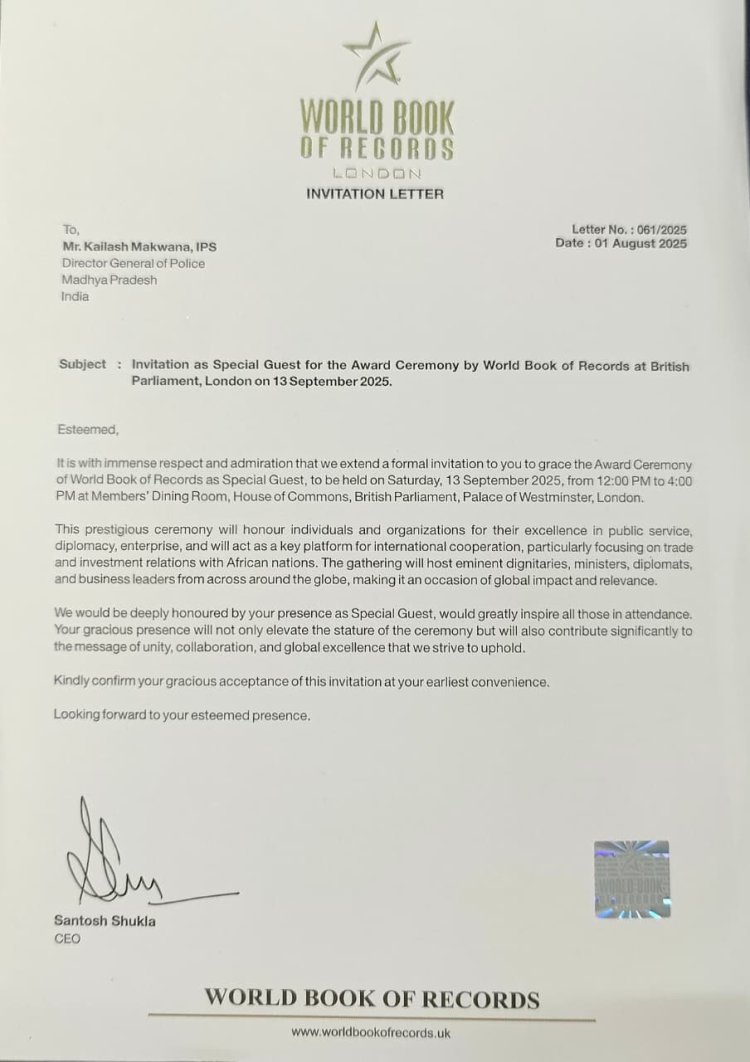 मध्यप्रदेश पुलिस के DGP कैलाश मकवाना को नशे के खिलाफ प्रभावी अभियान के लिए लंदन में होने वाली "World Book of Records" के अवॉर्ड सेरेमनी में विशेष अतिथि के रूप में आमंत्रित किया गया है।