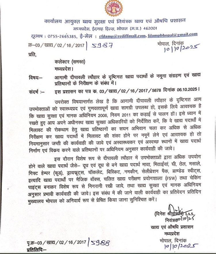 दीपावली में खाद्य पदार्थों में मिलावट को रोकने के लिए मध्यप्रदेश में मिलावट से मुक्ति अभियान को और तेज कर दिया गया है. राज्य के फूड कंट्रोलर दिनेश श्रीवास्तव ने सभी जिला कलेक्टरों को पत्र लिखकर विशेष निर्देश जारी किए हैं.