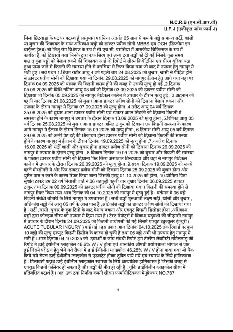 डॉ. अंकित सल्लाम ने कहा, यह बेहद दुखद है। मिलावटी सिरप ने बच्चों की जान ली। अभिभावकों से अपील है कि बिना डॉक्टरी सलाह के सिरप न दें। मृतकों के परिवारों को 4-4 लाख की सहायता और इलाज का खर्च सरकार देगी।