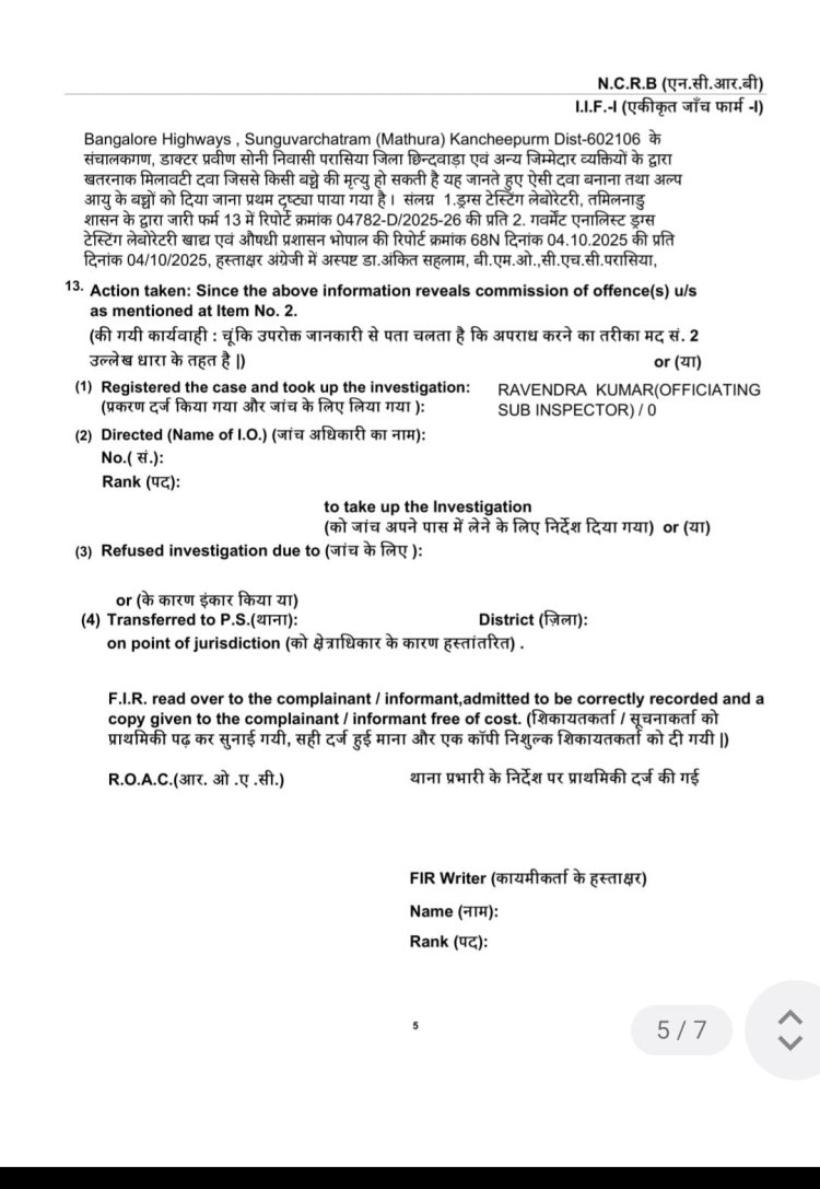 सीएम ने बताया कि काचीपुरम में फैक्ट्री होने के कारण तमिलनाडु सरकार से भी Coldrif के टेस्ट कराने का अनुरोध किया गया था। जांच रिपोर्ट शनिवार सुबह मिली है और उसके आधार पर कड़ी कार्रवाई की जा रही है। राज्य स्तर पर भी एक टीम गठित की गई है। सीएम ने कहा कि बच्चों की दर्दनाक मौत के बाद स्थानीय स्तर पर कार्रवाई जारी है। दोषियों को किसी भी कीमत पर बख्शा नहीं जाएगा