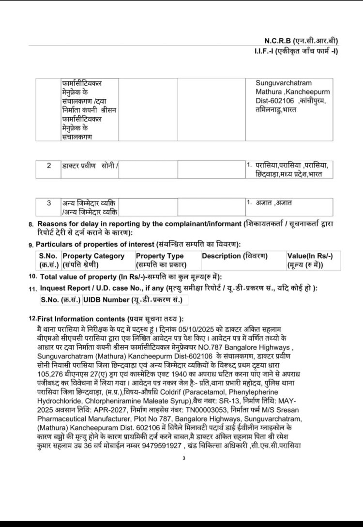कोल्ड्रिफ कफ सिरप लिखने वाला डॉक्टर गिरफ्तार,फार्मा कंपनी पर भी FIR