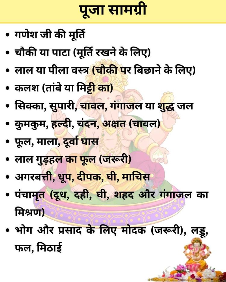 सबसे पहले चौकी पर लाल या पीला वस्त्र बिछाकर उस पर गणेश जी की मूर्ति स्थापित करें। इसके बाद कलश में जल, चावल, सुपारी और एक सिक्का डालकर उसे भी स्थापना करें। फिर गणेश जी की मूर्ति को पंचामृत से स्नान कराएं और मूर्ति पर कुमकुम, हल्दी तथा चंदन का तिलक लगाएं। इसके बाद मूर्ति को दूर्वा घास, फूल और माला से सजाएं। अंत में मोदक, लड्डू और अन्य प्रसाद चढ़ाकर भोग लगाएं।
