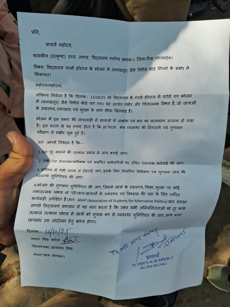 रीवा गर्ल्स हॉस्टल के खाने में मिला कीड़ा, छात्राओं की तबीयत बिगड़ी, प्रबंधन घेरे में
