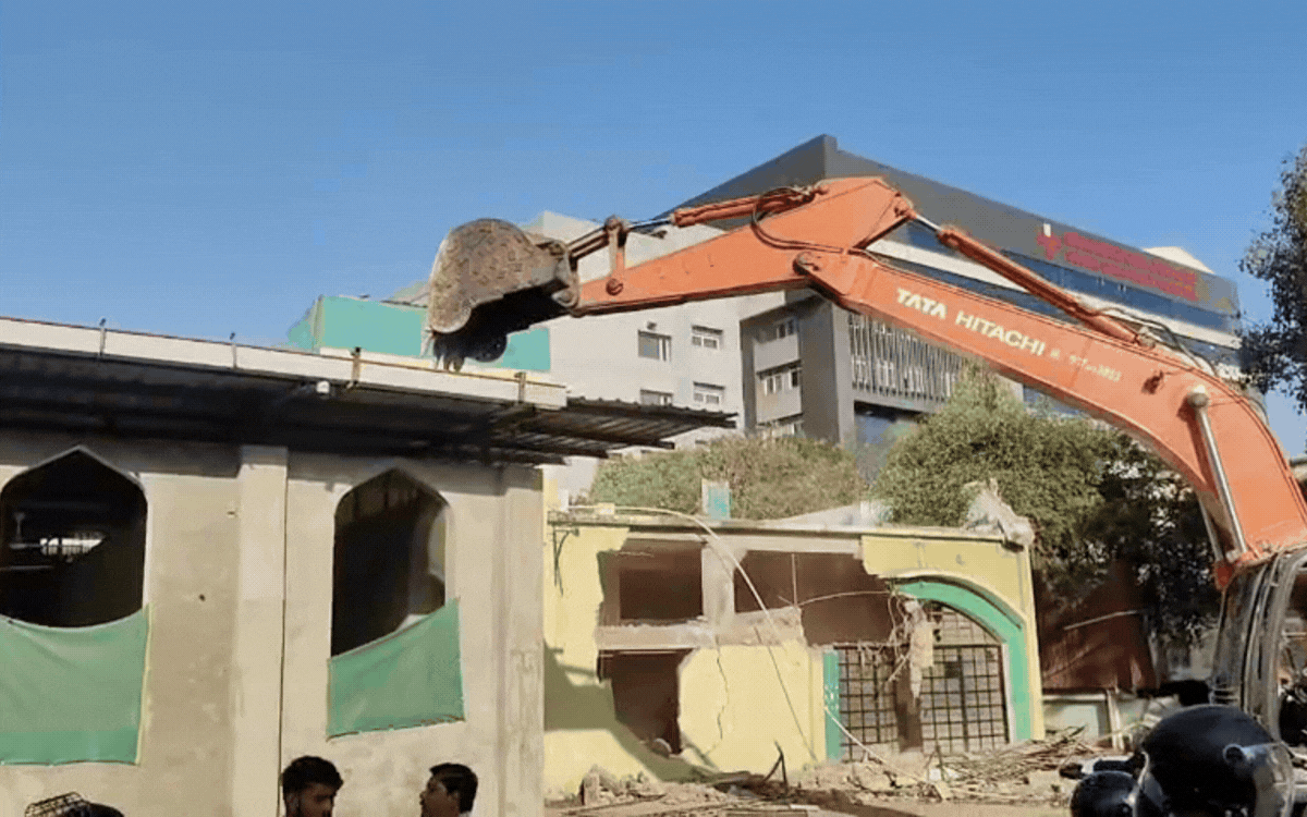 धर्मस्थल के आसपास बनी बाउंड्रीवाल को सबसे पहले हटाया गया