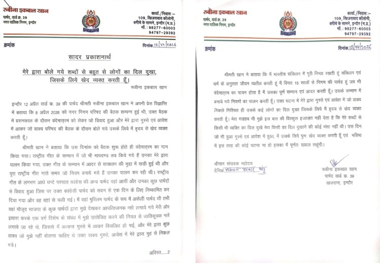 रुबीना इकबाल खान ने भाजपा पार्षदों और अपनी ही पार्टी को लेकर दिए गए बयान पर खेद व्यक्त किया है। उन्होंने कहा कि उनके बयान से यदि किसी की भावनाएं आहत हुई हैं, तो वह इसके लिए खेद प्रकट करती हैं। बता दें कि वंदे मातरम को लेकर शहर में पहले से ही सियासी माहौल गरमाया हुआ है, ऐसे में कांग्रेस पार्षद के इस यू-टर्न को राजनीतिक रूप से भी अहम माना जा रहा है।