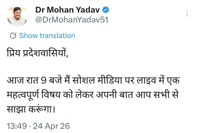 भोपाल। मध्यप्रदेश के मुख्यमंत्री डॉ. मोहन यादव आज यानी 24 अप्रैल की रात 9 बजे सोशल मीडिया पर लाइव रहेंगे। इस दौरान सीएम बेहद अहम विषय को लेकर प्रदेशवासियों से अपनी बात साझा करेंगे। इस कार्यक्रम को लेकर प्रदेशभर में उत्साह का माहौल है।