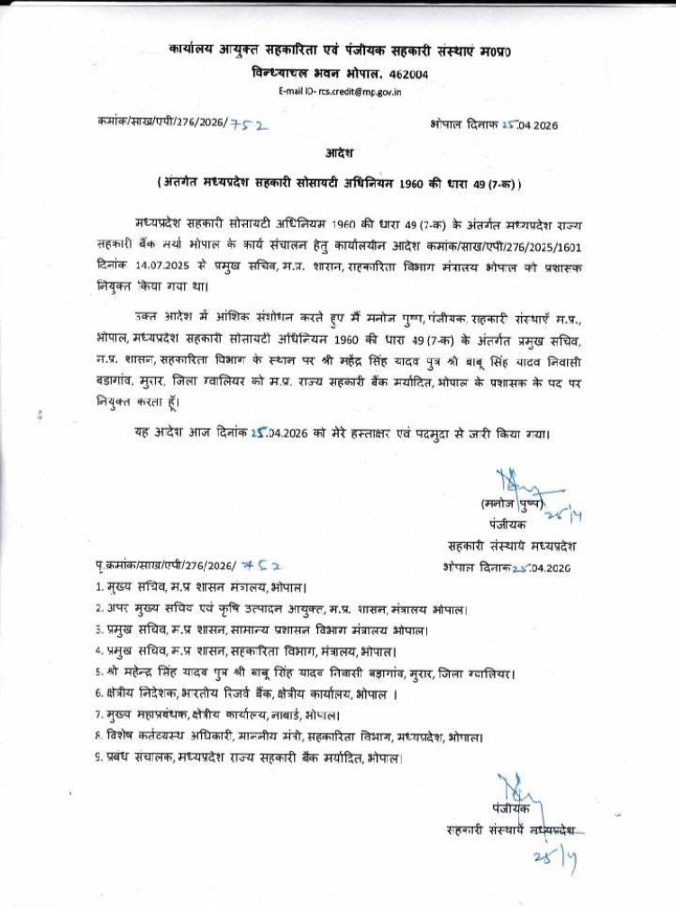 मध्य प्रदेश में इन दिनों राजनीतिक और प्रशासनिक नियुक्तियों का सिलसिला तेज हो गया है। इसी कड़ी में ग्वालियर निवासी महेंद्र सिंह यादव को अपेक्स बैंक का प्रशासक नियुक्त किया गया है। पंजीयक सहकारी संस्थाएं, भोपाल द्वारा 25 अप्रैल 2026 को जारी आदेश में यह नियुक्ति की गई है।