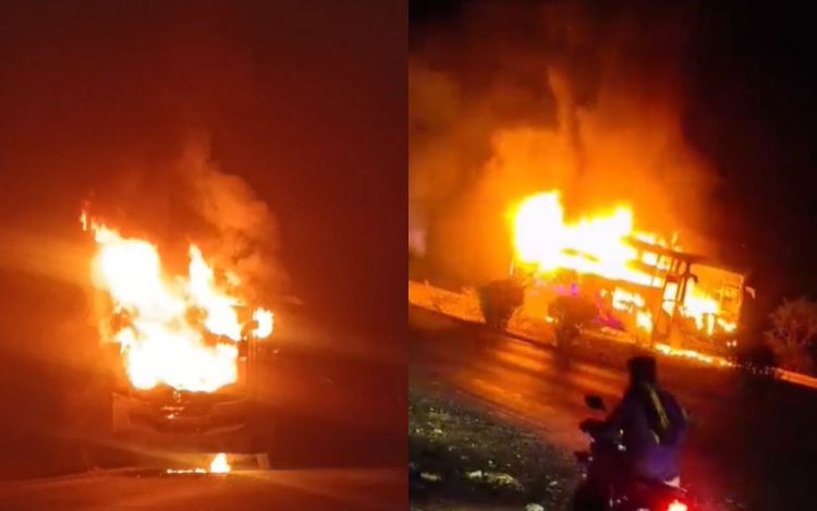 मैहर जिले के देहात थाना क्षेत्र अंतर्गत भेड़ा गेट के पास मंगलवार रात एक चलती यात्री बस में भीषण आग लग गई। रात करीब 11 बजे हुई इस घटना में बस धू-धू कर जल गई। बस में सवार ड्राइवर, कंडक्टर और हेल्पर ने कूदकर अपनी जान बचाई।