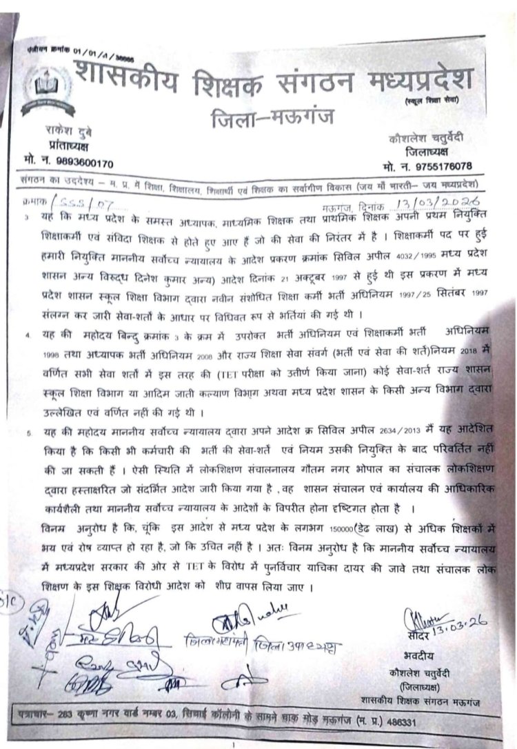 संगठन द्वारा सौंपे गए ज्ञापन में टीईटी परीक्षा को लेकर राज्य सरकार की भूमिका पर सवाल उठाए गए हैं। शिक्षकों का कहना है कि सर्वोच्च न्यायालय में लंबित प्रकरण के संबंध में राज्य शासन को पुनर्विचार याचिका दायर करनी चाहिए। साथ ही, लोकशिक्षण संचालनालय भोपाल द्वारा जारी आदेश को शिक्षक हितों के विपरीत बताते हुए तत्काल निरस्त करने की मांग की गई है।