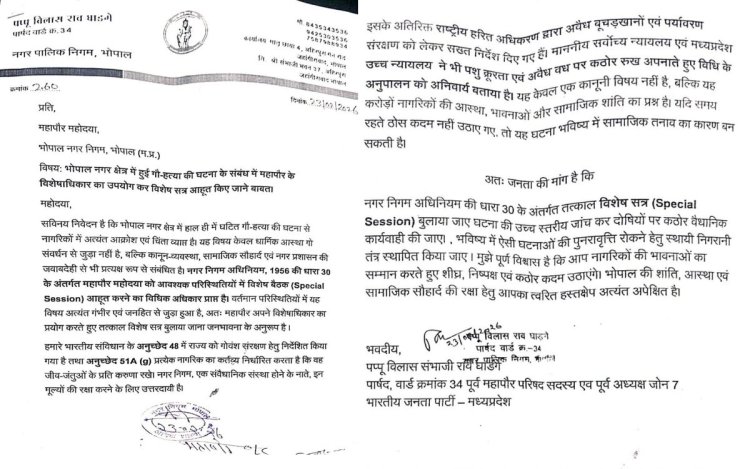 भोपाल नगर निगम में स्लॉटर हाउस में गोमांस मिलने के मामले को लेकर बीजेपी पार्षद विलास राव घाड़गे ने महापौर मालती राय को पत्र लिखकर नगर निगम का विशेष सत्र बुलाने की मांग की है। पार्षद ने पत्र में कहा कि गौ-हत्या की घटना से नागरिकों में अत्यंत आक्रोश और चिंता व्याप्त है और यह मुद्दा केवल धार्मिक आस्था या गो-संवर्धन से संबंधित नहीं है, बल्कि कानून-व्यवस्था, सामाजिक सौहार्द और नगर प्रशासन की जवाबदेही से भी प्रत्यक्ष रूप से जुड़ा है। उन्होंने महापौर से अनुरोध किया कि अपने विशेषाधिकार का प्रयोग करते हुए तुरंत विशेष सत्र बुलाया जाए और दोषियों पर कड़ी कार्रवाई की जाए।