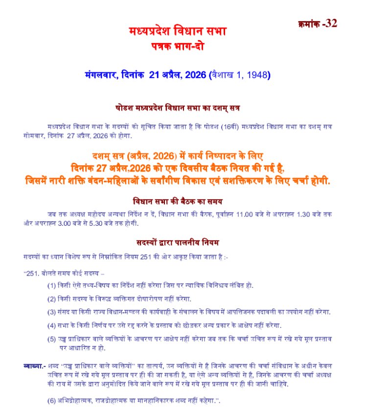 मध्यप्रदेश विधानसभा का विशेष सत्र 27 अप्रैल को आयोजित किया जाएगा, जिसमें महिलाओं के सशक्तीकरण और “नारी शक्ति वंदन” से जुड़े महत्वपूर्ण विषयों पर विस्तृत चर्चा होगी। विधानसभा सचिवालय की ओर से इस विशेष सत्र को लेकर आधिकारिक अधिसूचना जारी कर दी गई है। सरकार का कहना है कि यह सत्र महिलाओं के सर्वांगीण विकास और उनके अधिकारों को मजबूत करने की दिशा में एक महत्वपूर्ण कदम होगा।