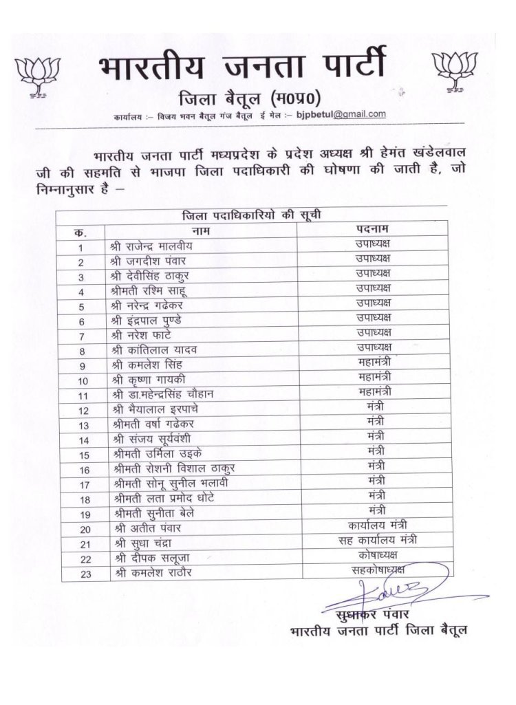 MP बीजेपी ने सीधी और बैतूल की जिला कार्यकारणी घोषित की