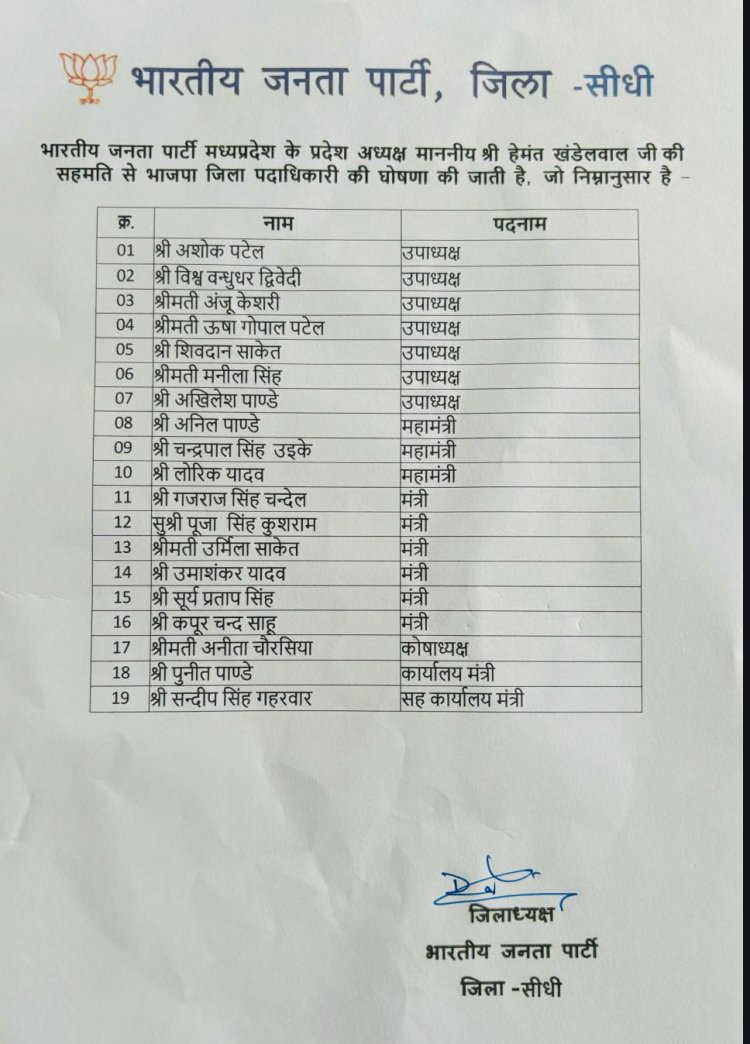 BREAKING NEWS: MP बीजेपी ने सीधी और बैतूल की जिला कार्यकारिणी घोषित की
