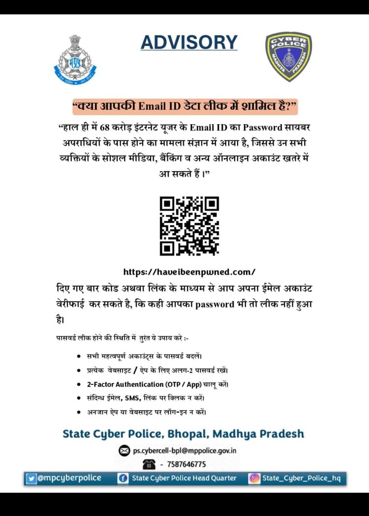 "हाल ही में 68 करोड़ इंटरनेट यूजर के Email ID का Password साइबर अपराधियों के पास होने का मामला संज्ञान में आया है। जिससे उन सभी व्यक्तियों के सोशल मीडिया, बैंकिंग व अन्य ऑनलाइन अकाउंट खतरे में आ सकते हैं।"