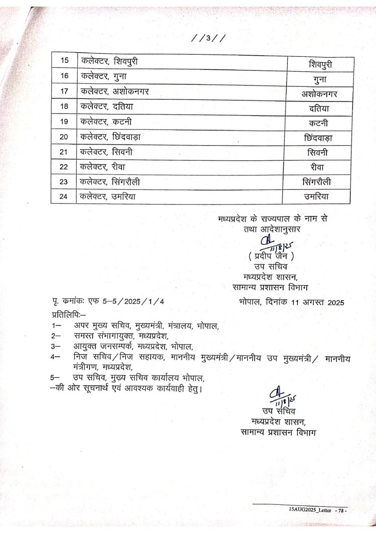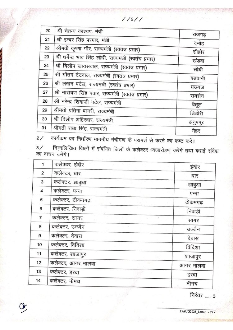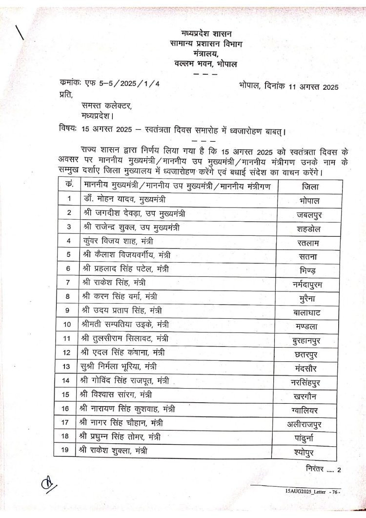 MP में राज्य शासन द्वारा 15 अगस्त 2025 को स्वतंत्रता दिवस समारोह के अवसर पर जिला मुख्यालयों में ध्वजारोहण के संबंध में आदेश जारी कर दिया गया है। मुख्यमंत्री डॉ. मोहन यादव भोपाल के लाल परेड ग्राउंड में ध्वजारोहण करेंगे तो वहीं उप मुख्यमंत्री जगदीश देवड़ा, जबलपुर उप मुख्यमंत्री राजेन्द्र शुक्ल शहडोल में ध्वजारोहण मंत्री कुंवर विजय शाह, रतलाम, कैलाश विजयवर्गीय सतना, प्रहलाद सिंह पटेल भिण्ड, राकेश सिंह नर्मदापुरम, करन सिंह वर्मा मुरैना, उदय प्रताप सिंह बालाघाट, सम्पतिया उइके मण्डला, तुलसीराम सिलावट बुरहानपुर, एदल सिंह कंषाना छतरपुर, निर्मला भूरिया मंदसौर, गोविंद सिंह राजपूत नरसिंहपुर, विश्वास सांरग खरगौन, नारायण सिंह कुशवाह ग्वालियर, नागर सिंह चौहान अलीराजपुर, प्रघुम्न सिंह तोमर पांढुर्ना, राकेश शुक्ला श्योपुर, चेतन्य काश्यप राजगढ़, इन्दर सिंह परमार दमोह, कृष्णा गौर, राज्यमंत्री सीहोर, धर्मेन्द्र भाव सिंह लोधी, राज्यमंत्री खंडवा, दिलीप जायसवाल, राज्यमंत्री सीधी, गौतम टेटवाल, राज्यमंत्री बडवानी, लखन पटेल, राज्यमंत्री मऊगंज नारायण सिंह पंवार, राज्यमंत्री रायसेन नरेन्द्र शिवाजी पटेल, राज्यमंत्री बैतूल प्रतिमा बागरी, राज्यमंत्री डिंडोरी, दिलीप अहिरवार, राज्यमंत्री अनुपपूर राधा सिंह, राज्यमंत्री मैहर इसके अलावा अन्य जिलों में कलेक्टर ध्वजारोहण करेंगे.