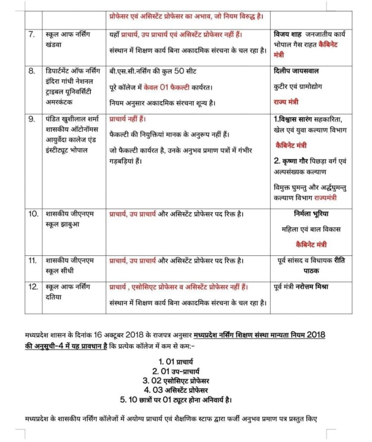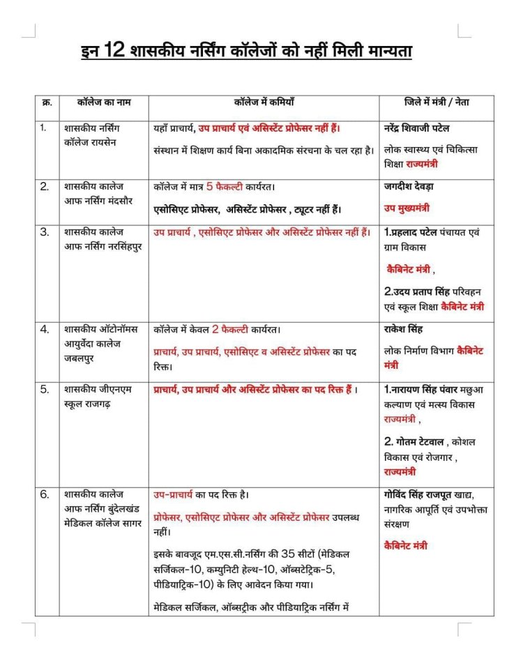 NSUI के प्रदेश उपाध्यक्ष रवि परमार ने सरकार पर लापरवाही का आरोप लगाते हुए कहा कि शासकीय नर्सिंग कॉलेजों की कमियों को लेकर एनएसयूआईं द्वारा की गई शिकायतों को गंभीरता से लिया होता तो आज यह परिस्थिति नहीं होती. सरकार की लापरवाही के चलते हजारों गरीब परिवार की छात्राएं नर्सिंग कॉलेजों में प्रवेश से वंचित रह जाएंगी, क्योंकि वो प्राइवेट कालेजों की फीस भरने में सक्षम नहीं हैं. इन 12 नर्सिंग कालेजों में लगभग 1 हजार सीटें हैं. रिपोर्ट के मुताबिक, जिन 12 कॉलेजों को मान्यता नहीं मिली उनमें रायसेन, मंदसौर, नरसिंहपुर, जबलपुर, सागर, खंडवा, अमरकंटक, भोपाल, झाबुआ, सीधी, राजगढ़ और दतिया के कॉलेज शामिल हैं.