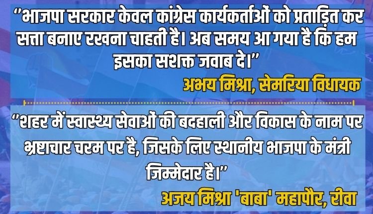 इस दौरान पूर्व मंत्री राजमणि पटेल ने कहा कि अब समय आ गया है सरकार की कमियों को जनता के बीच ले जाने का। सेमरिया विधायक अभय मिश्रा ने कहा भाजपा सरकार केबल कांग्रेस कार्यकर्ताओं को प्रताड़ित कर सत्ता बनाए रखना चाहती है। अब समय आ गया है कि हम इसका सशक्त जवाब दे।
