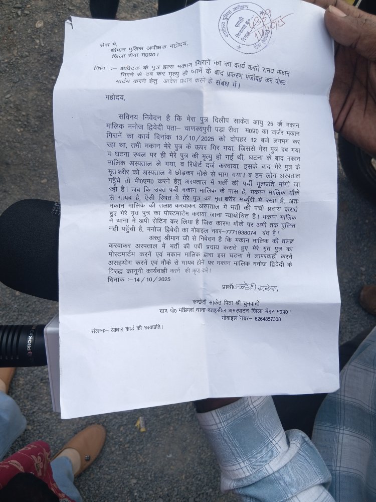 रीवा में जर्जर मकान को गिराते समय एक मजदूर की मौत हो गई। जिसके बाद मृतक का भाई कन्छेदी साकेत 14 अक्टूबर को जिला पुलिस अधीक्षक कार्यालय पहुंचा और मकान मालिक मनोज द्विवेदी के खिलाफ शिकायत दर्ज कर कानूनी कार्रवाई की मांग की।