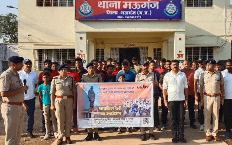 वहीं मऊगंज में भी सरदार पटेल की 150वीं जयंती वर्ष के उपलक्ष्य में साइकिल रैली का आयोजन किया गया। रैली को पुलिस अधीक्षक दिलीप कुमार सोनी ने हरी झंडी दिखाकर रवाना किया। कार्यक्रम की शुरुआत पुलिस कार्यालय परिसर में सामूहिक ‘वंदे मातरम’ गायन के साथ हुई, जिससे पूरा वातावरण देशभक्ति के उत्साह से भर गया। इस अवसर पर अतिरिक्त पुलिस अधीक्षक विक्रम सिंह परिहार, एसडीओपी सचि पाठक, प्रभारी रक्षित निरीक्षक अमित विश्वकर्मा, यातायात प्रभारी नरेश प्रताप सिंह सहित जिले के समस्त थाना एवं चौकी प्रभारी और अन्य अधिकारी-कर्मचारी उपस्थित रहे।