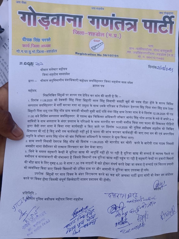 जयसिंहनगर अस्पताल में डॉक्टर पर गंभीर आरोप, गोंडवाना गणतंत्र पार्टी युवा मोर्चा ने सौंपा ज्ञापन