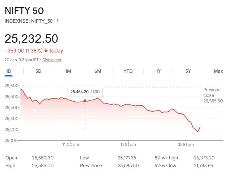 20 जनवरी, मंगलवार को शेयर बाजार गिरावट के साथ लाल निशान पर बंद हुआ। कारोबारी सत्र में सेंसेक्स 1065 अंक गिरकर 82,180 पर, जबकि निफ्टी 353 अंक की गिरावट के साथ 25,233 पर बंद हुआ।