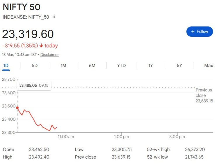 12 मार्च को भारतीय शेयर बाजार गिरावट के साथ खुला, जहां सेंसेक्स और निफ्टी दोनों लाल निशान में कारोबार कर रहे हैं। सेंसेक्स और निफ्टी के ज्यादातर शेयरों में गिरावट है, जबकि कुछ ही कंपनियों के शेयर हरे निशान में ट्रेड कर रहे हैं।