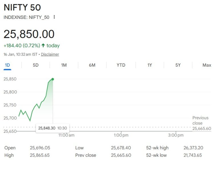 16 जनवरी, शुक्रवार को शेयर बाजार बढ़त के साथ हरे निशान पर खुला। कारोबारी सत्र में सेंसेक्स 200 अंक बढ़कर 83,600 पर, जबकि निफ्टी 50 अंक की तेजी के साथ 25,700 पर कारोबार कर रहा है।
