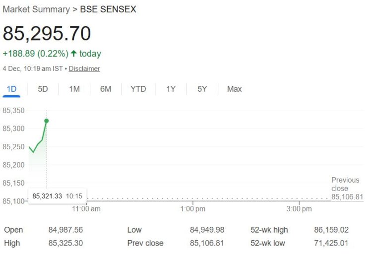 गुरुवार, 4 दिसंबर को कारोबारी सत्र में बाजार हरे निशान के साथ खुला। सेंसेक्स 200 अंक चढ़कर 85,300 पर, जबकि निफ्टी भी 50 अंक की बढ़त के साथ 26,040 पर कारोबार कर रहा है।