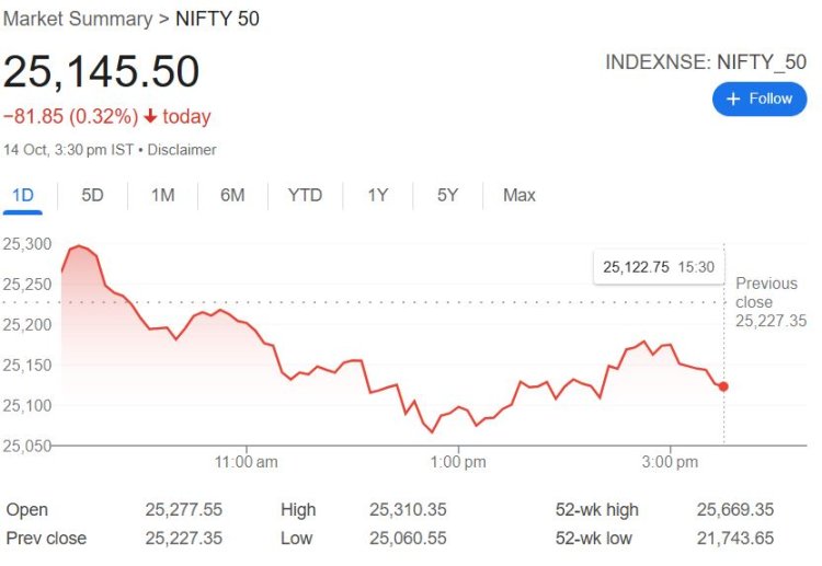 मंगलवार 14 अक्टूबर को बाजार गिरावट के साथ बंद हुआ। कारोबारी सत्र में सेंसेक्स 297 अंक गिरकर 82,030 पर जबकि निफ्टी 82 अंक गिरकर 25,146 पर बंद हुआ। आज बाजार जहां बढ़त के साथ खुला था वहीं शाम होते-होते ये गिरावट में बदल गया। सेंसेक्स के 30 में से 26 शेयर्स गिरावट के साथ बंद हुए। तो वहीं निफ्टी के शेयर्स में भी गिरावट हुई।