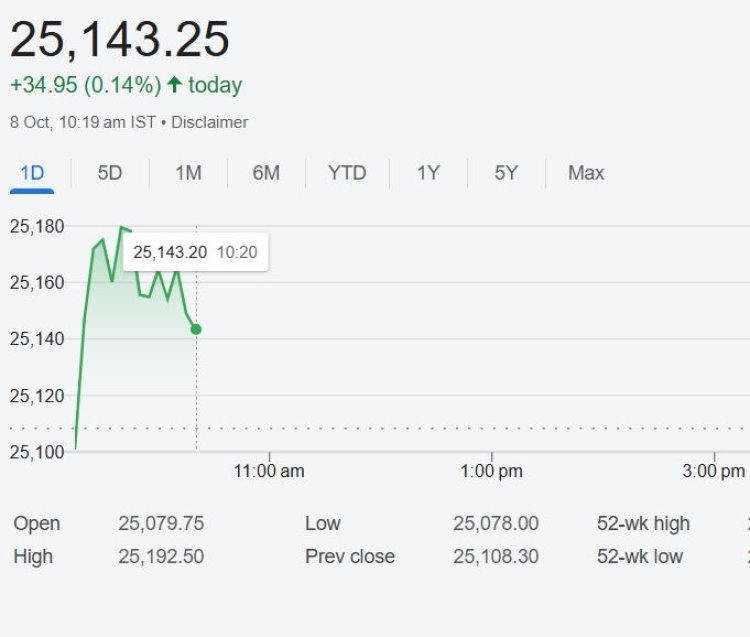 8 अक्टूबर बुधवार को शेयर बाजार बढ़त के साथ खुला. कारोबारी सत्र में सेंसेक्स 300 अंक बढ़कर 82,250 पर जबकि निफ्टी 80 अंक की बढ़त के साथ 25,180 पर कारोबार कर रहा है.