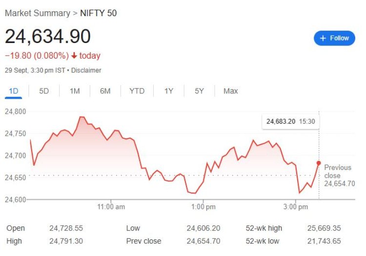 आज शेयर बाजार में उतार चढ़ाव भरा दिन रहा. हफ्ते के पहले दिन बाजार खुलने के साथ जहां मार्केट में तेजी थी तो वहीं शाम होते-होते ये गिरावट में बदल गई. कारोबारी सत्र में सेंसेक्स 62 अंक गिरकर 80,364 पर तो वहीं निफ्टी 20 अंक गिरकर 24,634 पर बंद हुआ.
