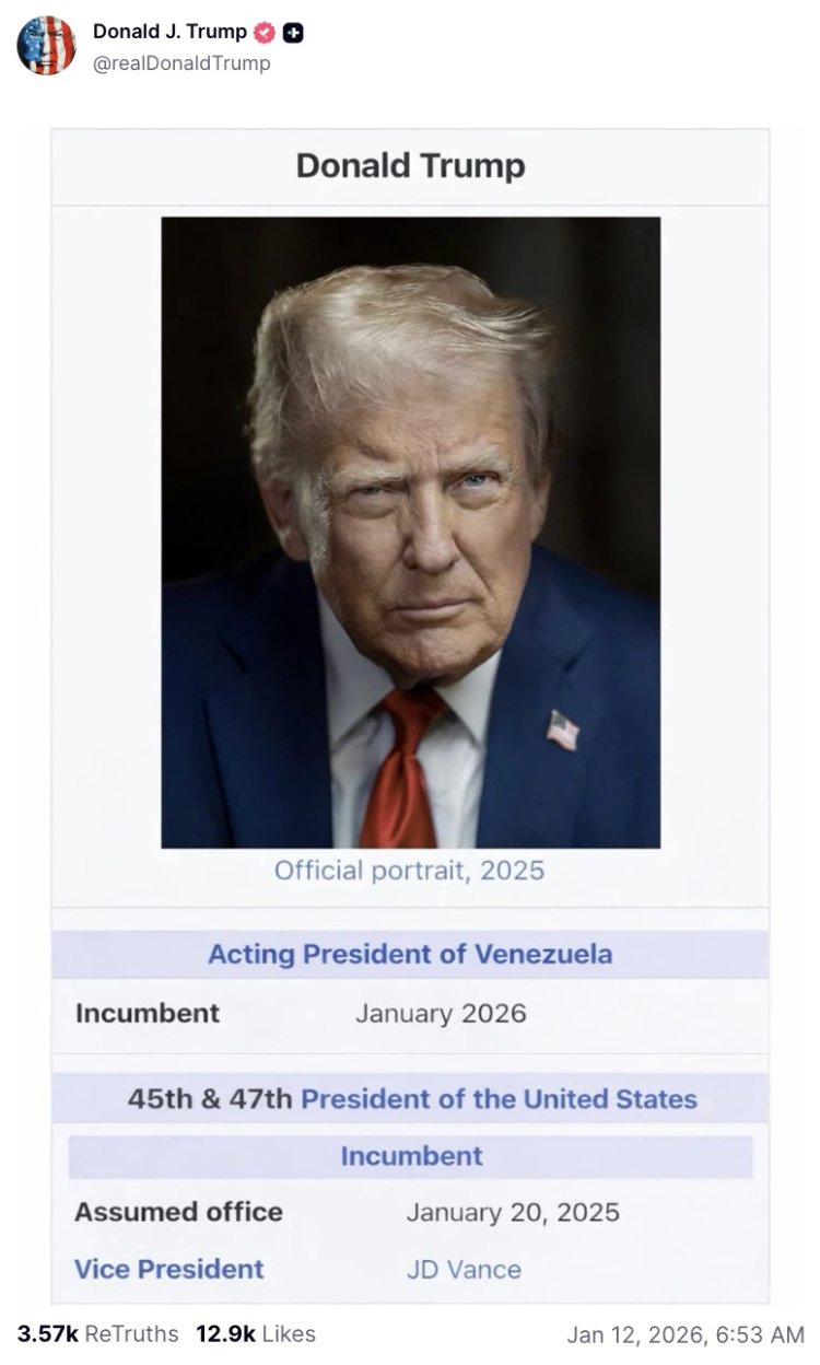अमेरिकी राष्ट्रपति डोनाल्ड ट्रंप ने खुद को वेनेजुएला का एक्टिंग प्रेसिडेंट घोषित किया। सोशल मीडिया प्लेटफॉर्म ट्रुथ सोशल पर एक पोस्ट में ट्रम्प की तस्वीर के साथ एक्टिंग प्रेसिडेंट ऑफ वेनेजुएला लिखा है, साथ ही जनवरी 2026 से पद संभालने का जिक्र भी है। इसके अलावा ट्रंप ने खुद को अमेरिका के 45वें और 47वें राष्ट्रपति के तौर पर भी दिखाया है।
