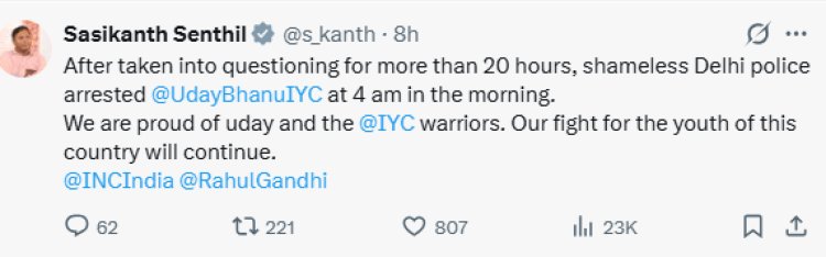 कांग्रेस नेताओं ने गिरफ्तारी की कड़ी निंदा की है . कांग्रेस सांसद शशिकांत सेंथिल ने X पर लिखा कि 20 घंटे से ज्यादा पूछताछ के बाद गिरफ्तार किया गया। उन्होंने कहा, "उदय और यूथ कांग्रेस के योद्धाओं पर गर्व है, लड़ाई जारी रहेगी।"