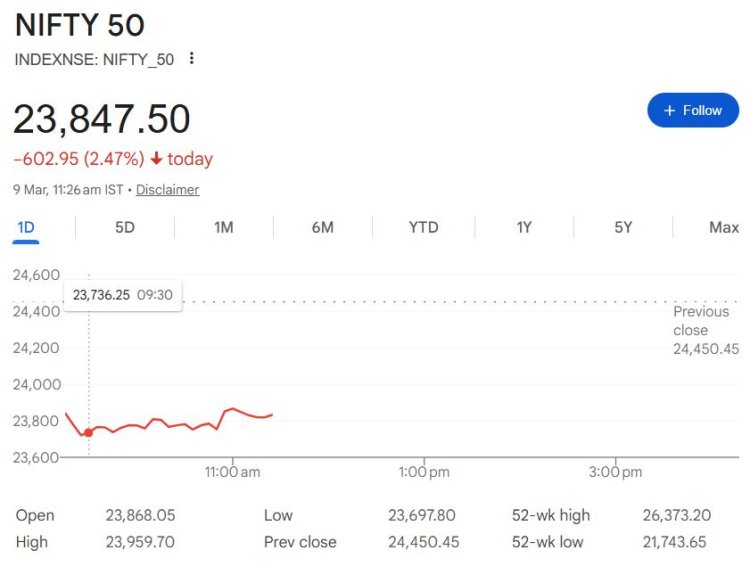 अमेरिका-इजराइल और ईरान की जंग का असर भारतीय शेयर बाजारों पर दिखने लगा है। सोमवार, 9 मार्च को शेयर बाजार गिरावट के साथ लाल निशान पर खुला। कारोबारी सत्र में सेंसेक्स 1,862 अंक की गिरावट के साथ 77,056.75 पर जबकि निफ्टी 583 की गिरावट के साथ 23,868.05 पर खुला।