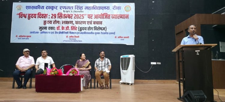 रीवा के टी.आर.एस. कॉलेज में विश्व हृदय दिवस के मौके पर हृदय रोगों से बचाव और स्वस्थ जीवनशैली पर एक जागरूकता कार्यक्रम आयोजित किया गया। मुख्य वक्ता डॉ. के.डी. सिंह ने युवाओं को संतुलित आहार, व्यायाम और तनावमुक्त जीवन के बारे में बताया।